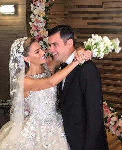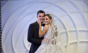 وأطلّت العروس بفستان أبيض رائع بتوقيع المصمم اللبناني العالمي ايلي صعب، وتميّز فستانها الأبيض بالأناقة والبساطة معاً وتفرّد بتطريزه الفخم بالحبات الفضية.وجاءت الطرحة مزخرفة ومطرزة أعطت الفستان طابعاً ملكياً فريداً، خصوصاً مع اعتماد العروس تسريحة شعر مرفوعة من الأمام.