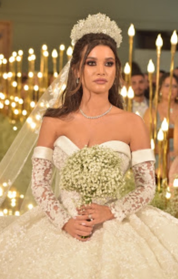 واعتمدت العروس فستاناً أبيض اللون كالأميرات الذي تميز بأكمامه الطويلة وطرحة طويلة.