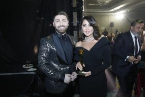 الممثلة القديرة رندة كعدي التي كرمت و استلمت تمثالها التكريمي من طبيب الاسنان علي جرادي و النجمة الكوميدية اللبنانية امل طالب .