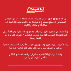 إن ادارة Pain D’or تستهجن بشدة ما يتم تداوله في وسائل التواصل الاجتماعي عن منتج مصنوع لدعم شعارات واهداف بعيدة كل البعد عن معتقداتنا وعاداتنا وتقاليدنا.