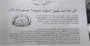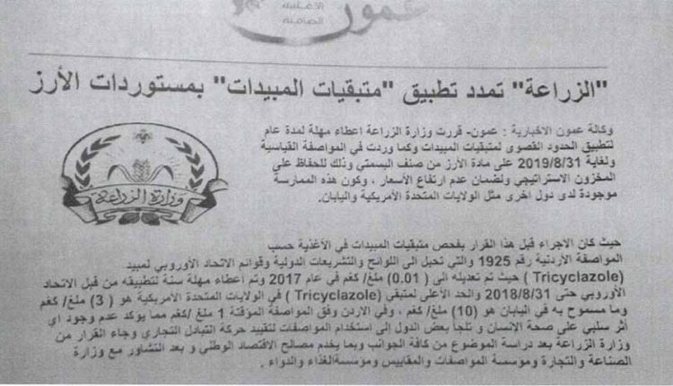 – بتاريخ 31/7/2017، أصدر معالي وزير الزراعة الاستاذ غازي زعيتر القرار رقم 586/1 (مرفق رقم 1) حدّد فيه نسبة متبقيات المبيدات في الأرز والشاي والفاكهة المجمّدة حسب الحد المسموح به من قبل لجنة دستور الغذاء Codex Alimentarius.