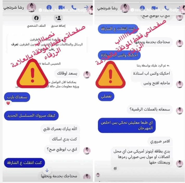 كتبت المخرجة رشا شربتجي على الصور التي نشرتها عبر صفحتها في منصة “فيسبوك”، باللون الأحمر “نصاب.. صفحاتي فقط الموثقة بالعلامة الزرقاء”، مرفقةً ذلك بـ “إيموجي” علامة التحذير. حيث تُظهر المحادثات حوارًا بين منتحل شخصية رشا وبين شخص آخر تطلب منه خدمة.