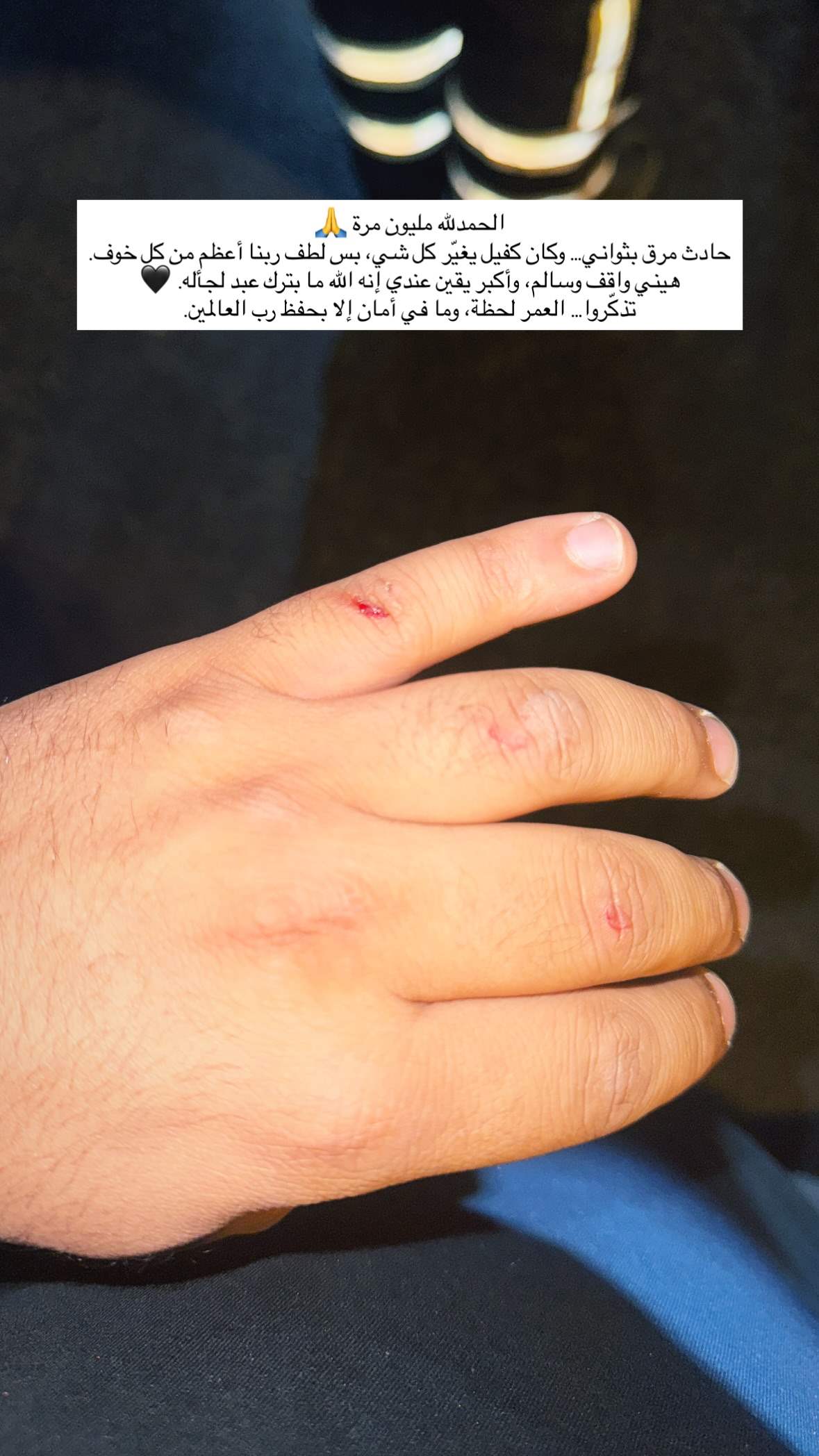 وفي الصورة الأخيرة، ظهرت يد الاخرس وقد تعرضت لبعض الجروح، وارفقها بتعليق شكر فيه الله عز وجل على لطفه به، وكتب: “الحمدلله مليون مرة، حادث مرق بثواني.. وكان كفيل يغيّر كلّ شي. بس لطف ربنا أعظم من كلّ خوف“.
