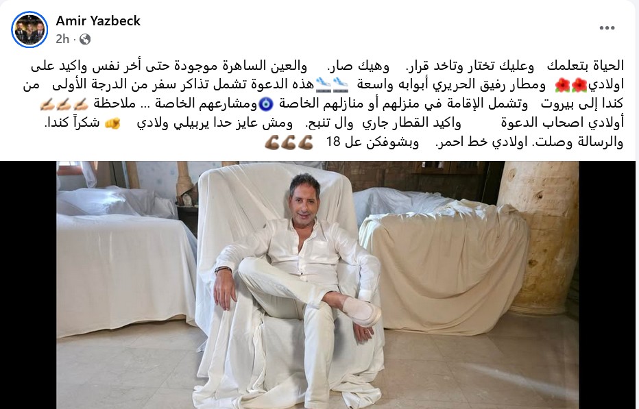 وكتب أمير قائلا: “الحياة بتعلمك وعليك تختار وتاخد قرار. وهيك صار. والعين الساهرة موجودة حتى آخر نفس واكيد على اولادي ومطار رفيق الحريري أبوابه واسعة هذه الدعوة تشمل تذاكر سفر من الدرجة الأولى من كندا إلى بيروت وتشمل الإقامة في منزلهم أو منازلهم الخاصة ومشاريعهم الخاصة”.